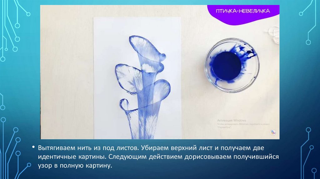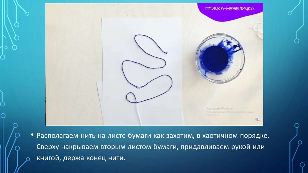 • Располагаем нить на листе бумаги как захотим, в хаотичном порядке.Сверху накрываем вторым листом бумаги, придавливаем рукой или