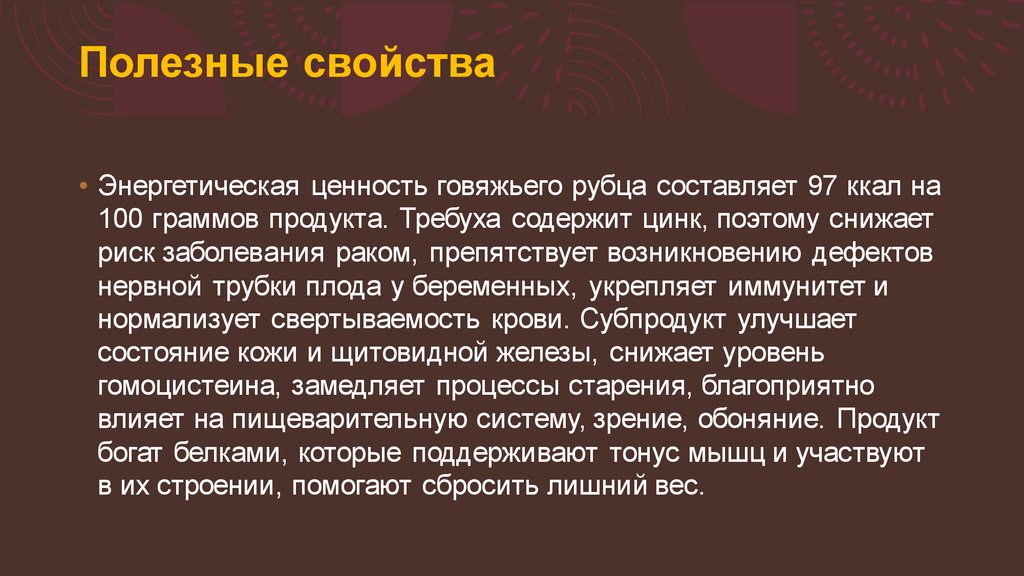 Полезные свойства• Энергетическая ценность говяжьего рубца составляет 97 ккал на