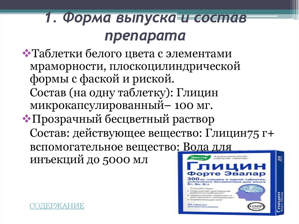 СОДЕРЖАНИЕ1. Форма выпуска и состав препарата
