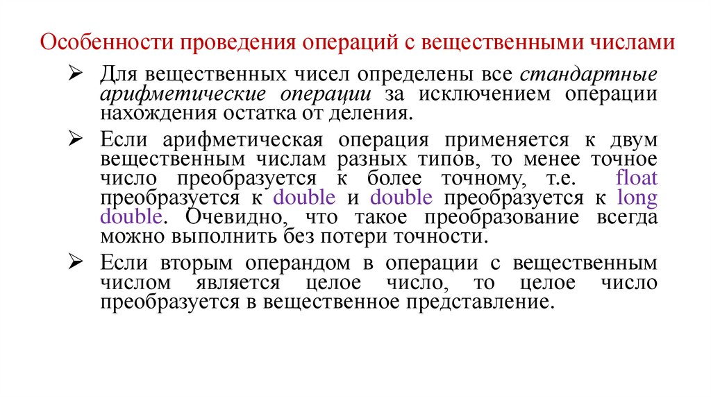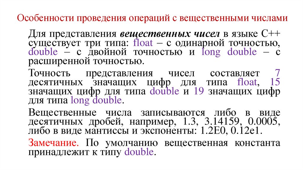 Особенности проведения операций с вещественными числамиДля представления вещественных чисел в языке С++