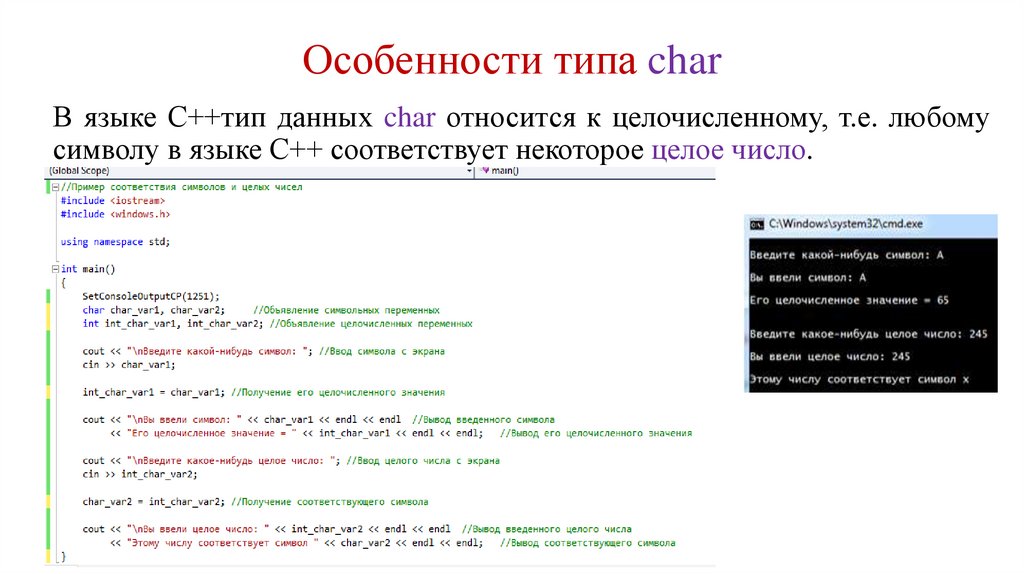 Особенности типа charВ языке С++тип данных char относится к целочисленному, т.е. любому