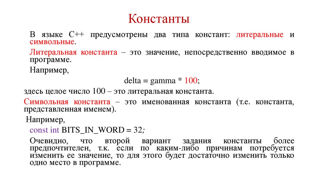 КонстантыВ языке С++ предусмотрены два типа констант: литеральные и