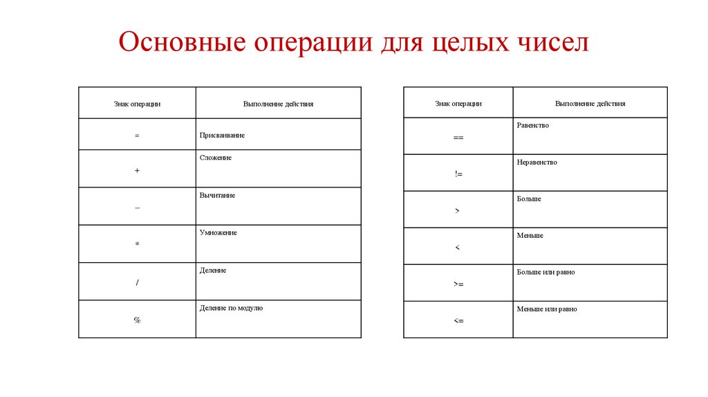 Основные операции для целых чиселЗнак операции