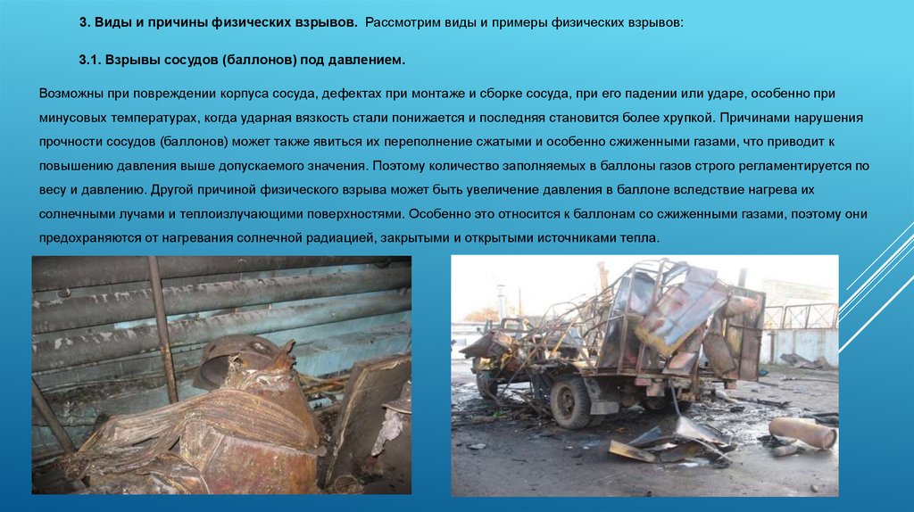 3. Виды и причины физических взрывов. Рассмотрим виды и примеры физических взрывов:3.1. Взрывы сосудов (баллонов) под давлением.