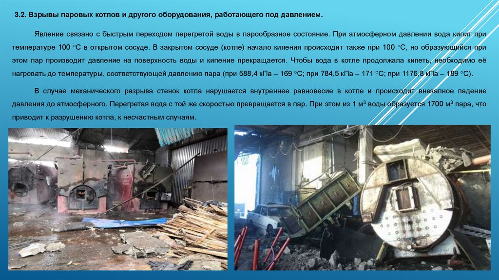 3.2. Взрывы паровых котлов и другого оборудования, работающего под давлением.Явление связано с быстрым переходом перегретой воды в парообразное состояние. При атмосферном давлении вода кипит при
