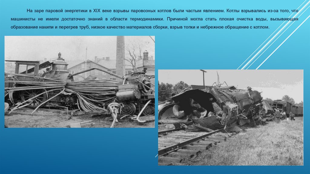 На заре паровой энергетики в XIX веке взрывы паровозных котлов были частым явлением. Котлы взрывались из-за того, чтомашинисты не имели достаточно знаний в области термодинамики. Причиной могла стать плохая очистка воды, вызывающая