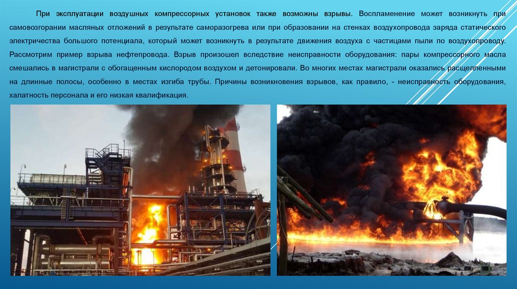 Рассмотрим пример взрыва нефтепровода. Взрыв произошел вследствие неисправности оборудования: пары компрессорного масла