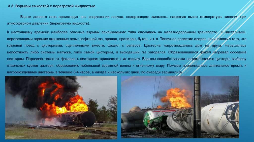 перевозящими горючие сжиженные газы: нефтяной газ, пропан, пропилен, бутан, и т. п. Типичное развитие аварии начиналось с того, что