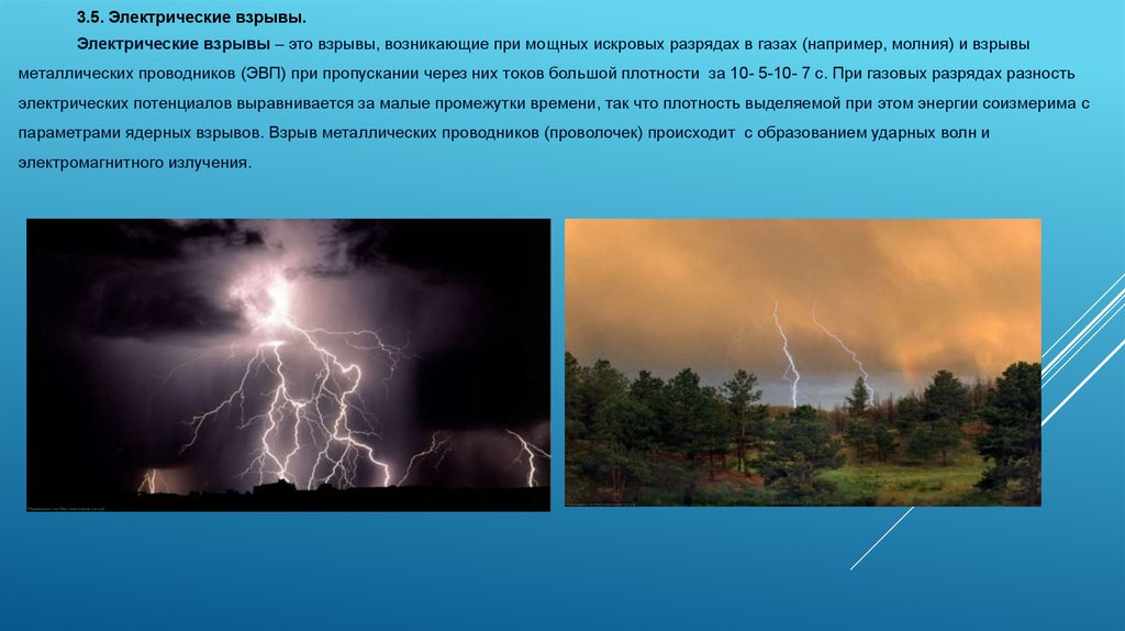 3.5. Электрические взрывы.Электрические взрывы – это взрывы, возникающие при мощных искровых разрядах в газах (например, молния) и взрывы