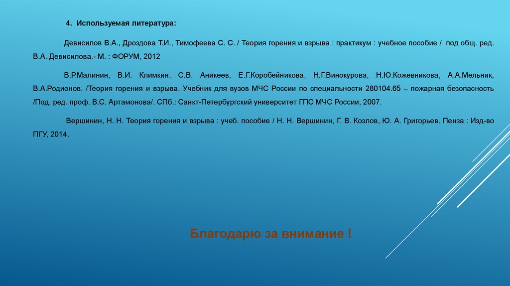 4. Используемая литература:Девисилов В.А., Дроздова Т.И., Тимофеева С. С. / Теория горения и взрыва : практикум : учебное пособие / под общ. ред.