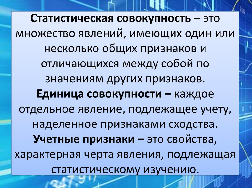 Статистическая совокупность – этомножество явлений, имеющих один или