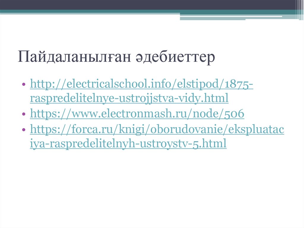 Пайдаланылған әдебиеттер• http://electricalschool.info/elstipod/1875raspredelitelnye-ustrojjstva-vidy.html