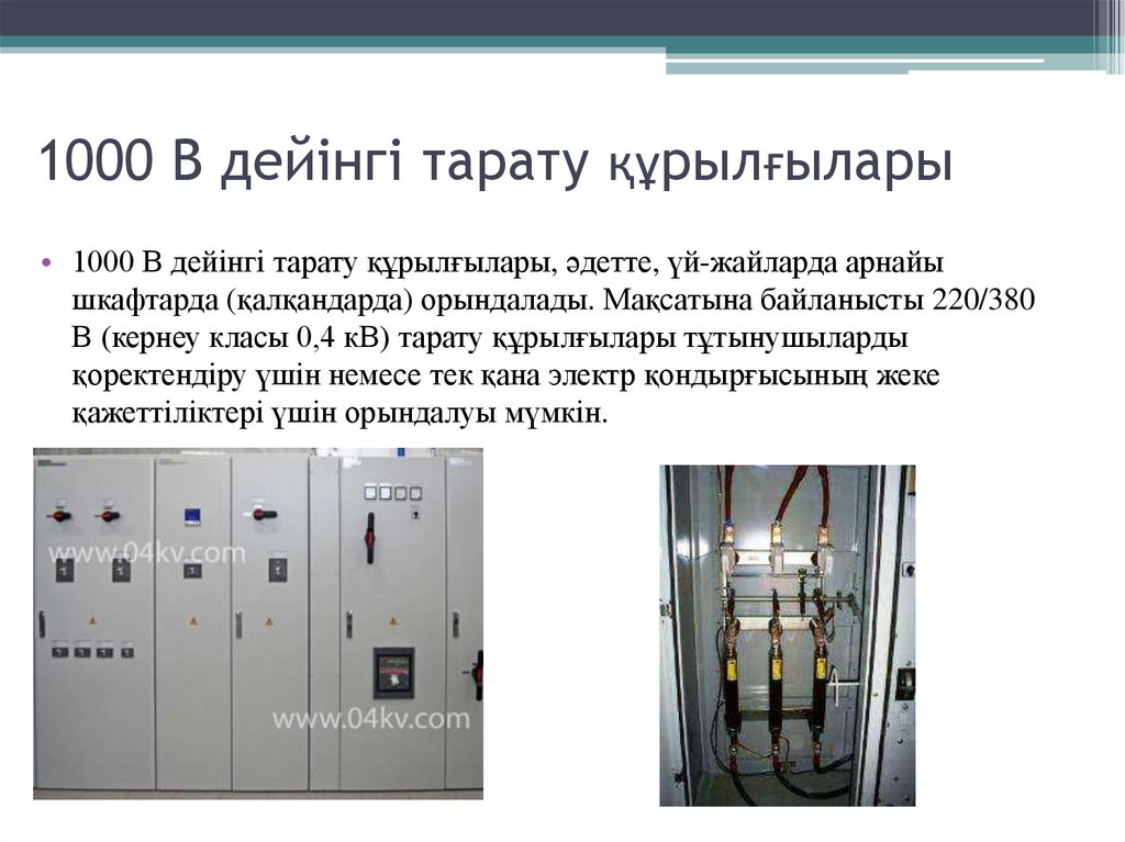 1000 В дейінгі тарату құрылғылары• 1000 В дейінгі тарату құрылғылары, әдетте, үй-жайларда арнайы