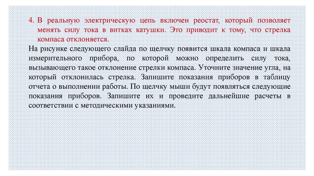 4. В реальную электрическую цепь включен реостат, который позволяетменять силу тока в витках катушки. Это приводит к тому, что стрелка