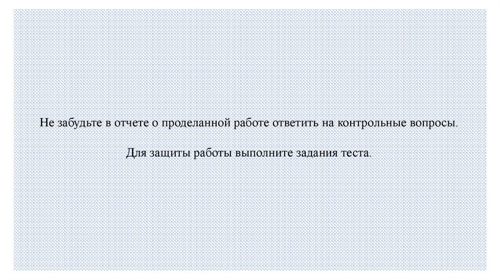 Не забудьте в отчете о проделанной работе ответить на контрольные вопросы.Для защиты работы выполните задания теста.