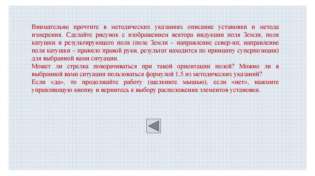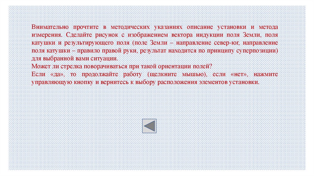 Внимательно прочтите в методических указаниях описание установки и методаизмерения. Сделайте рисунок с изображением вектора индукции поля Земли, поля