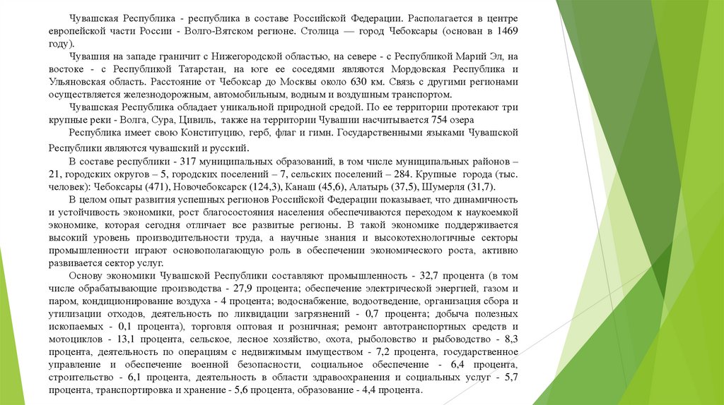 Чувашская Республика - республика в составе Российской Федерации. Располагается в центреевропейской части России - Волго-Вятском регионе. Столица — город Чебоксары (основан в 1469
