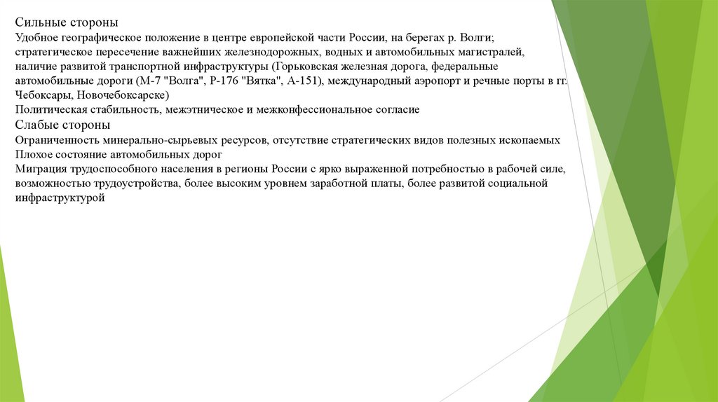 Сильные стороныУдобное географическое положение в центре европейской части России, на берегах р. Волги;