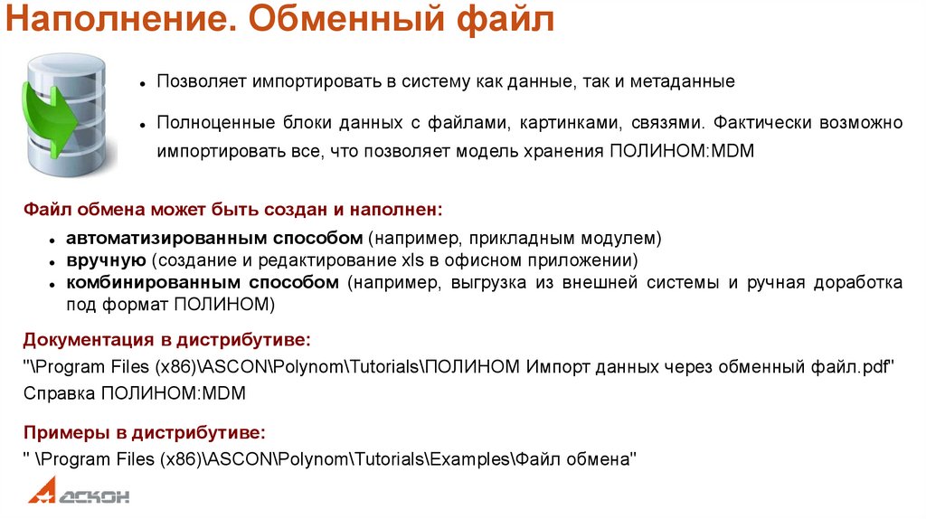 Наполнение. Обменный файлПозволяет импортировать в систему как данные, так и метаданные