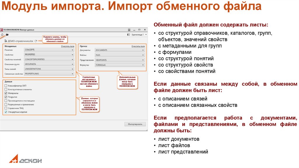 Модуль импорта. Импорт обменного файлаОбменный файл должен содержать листы:
