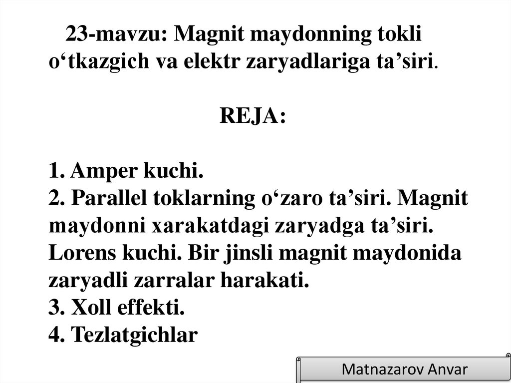23-mavzu: Magnit maydonning toklio‘tkazgich va elektr zaryadlariga ta’siri.
