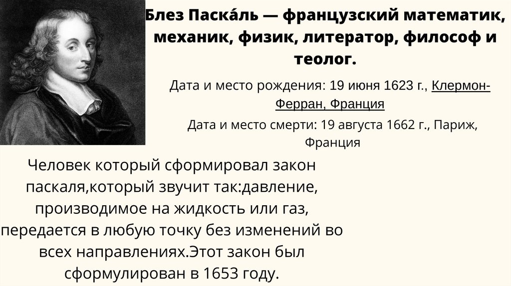 Блез Паска́ль — французский математик,механик, физик, литератор, философ и