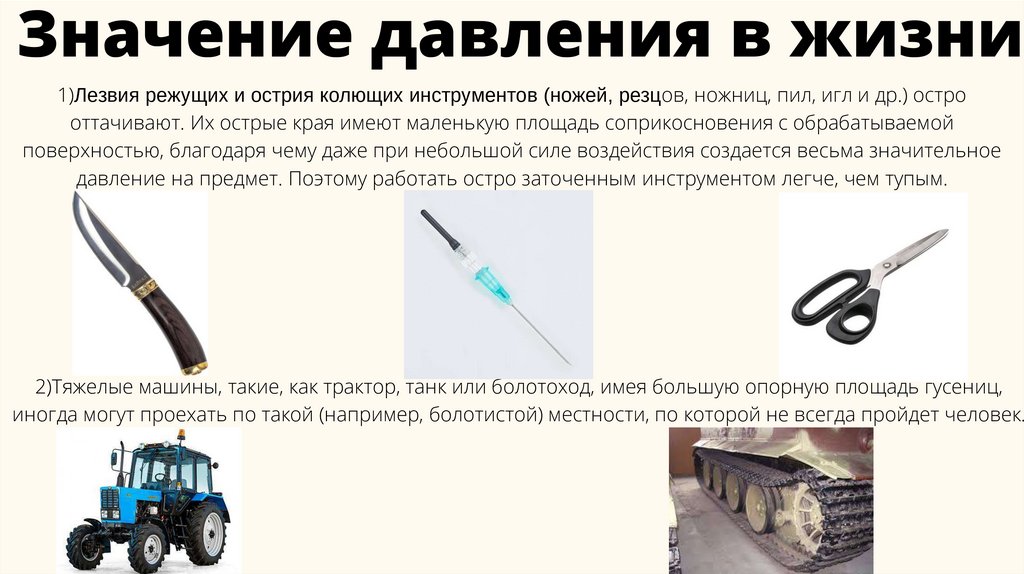Значение давления в жизни1)Лезвия режущих и острия колющих инструментов (ножей, резцов, ножниц, пил, игл и др.) остро