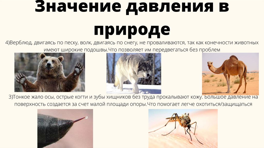 3)Тонкое жало осы, острые когти и зубы хищников без труда прокалывают кожу. Большое давление на