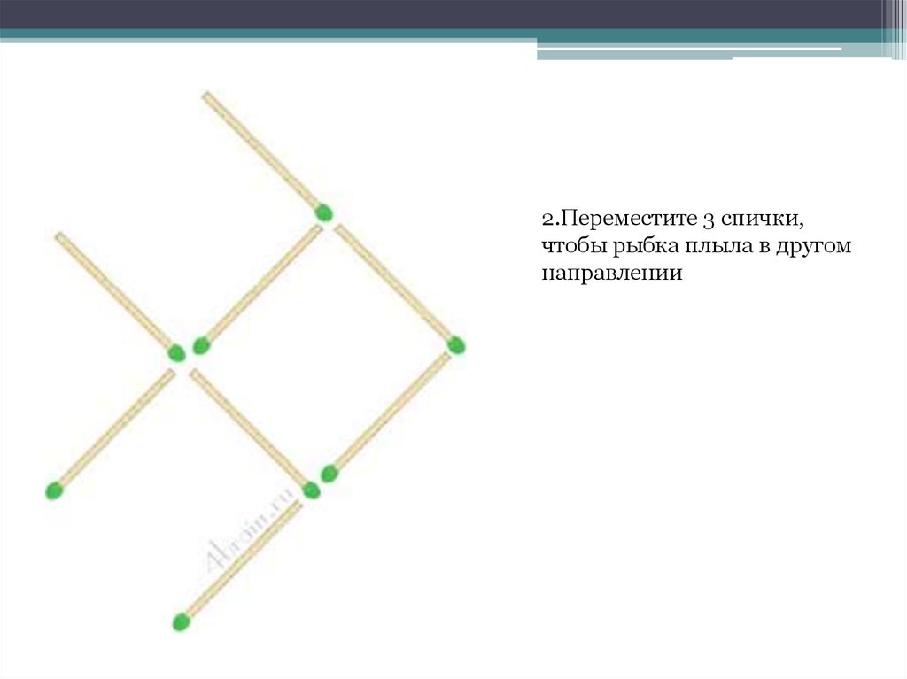 2.Переместите 3 спички,чтобы рыбка плыла в другом