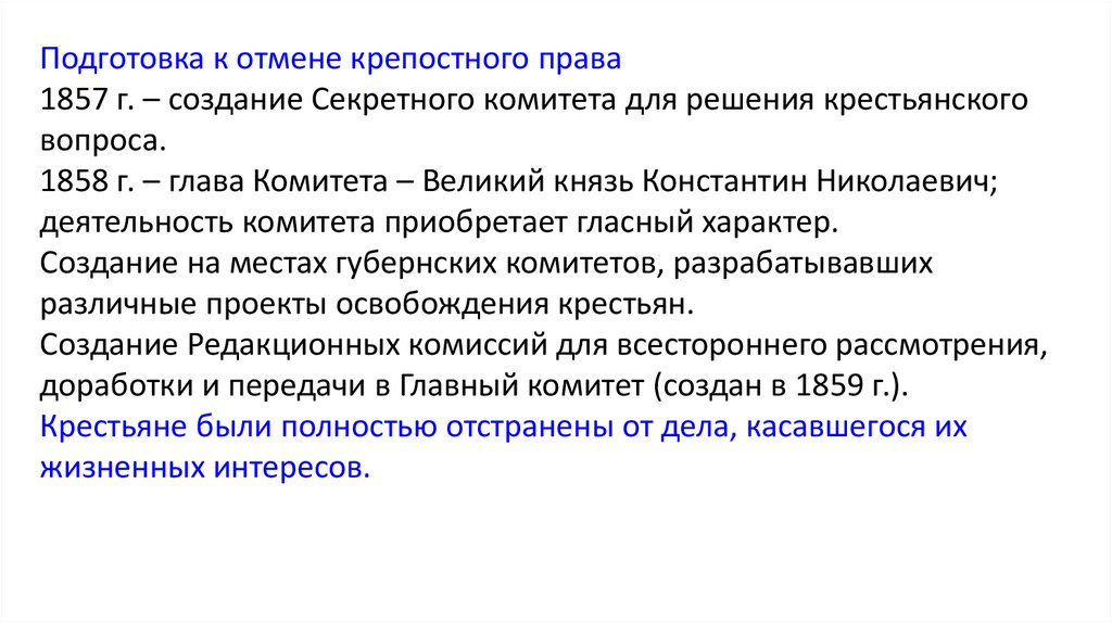 Подготовка к отмене крепостного права1857 г. – создание Секретного комитета для решения крестьянского