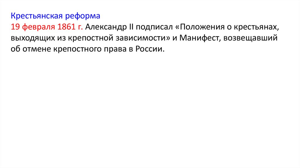 Крестьянская реформа19 февраля 1861 г. Александр II подписал «Положения о крестьянах,