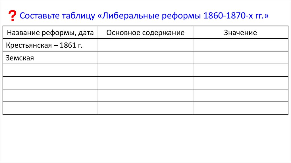 ? Составьте таблицу «Либеральные реформы 1860-1870-х гг.»Название реформы, дата