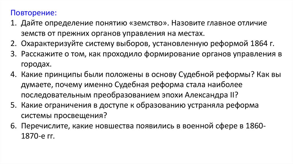 Повторение:1. Дайте определение понятию «земство». Назовите главное отличие