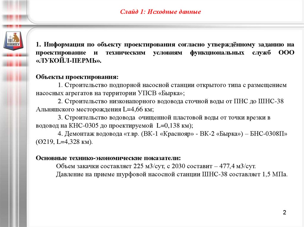 Слайд 1: Исходные данные1. Информация по объекту проектирования согласно утверждённому заданию на