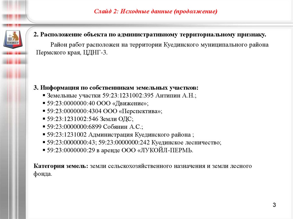 Слайд 2: Исходные данные (продолжение)2. Расположение объекта по административному территориальному признаку.