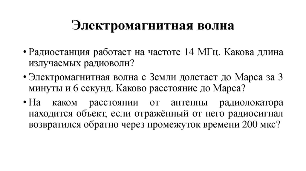 Электромагнитная волна• Радиостанция работает на частоте 14 МГц. Какова длина