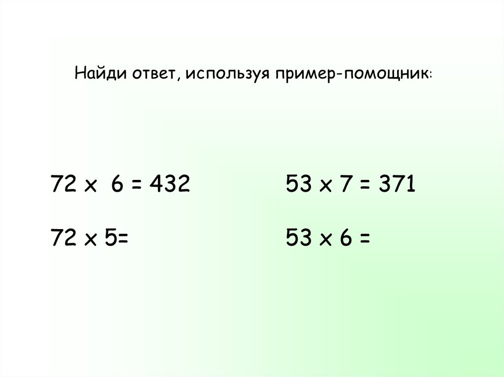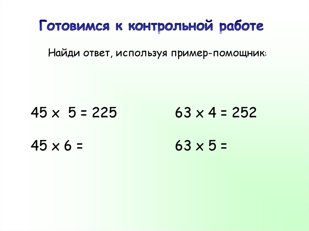 Найди ответ, используя пример-помощник:45 х 5 = 225