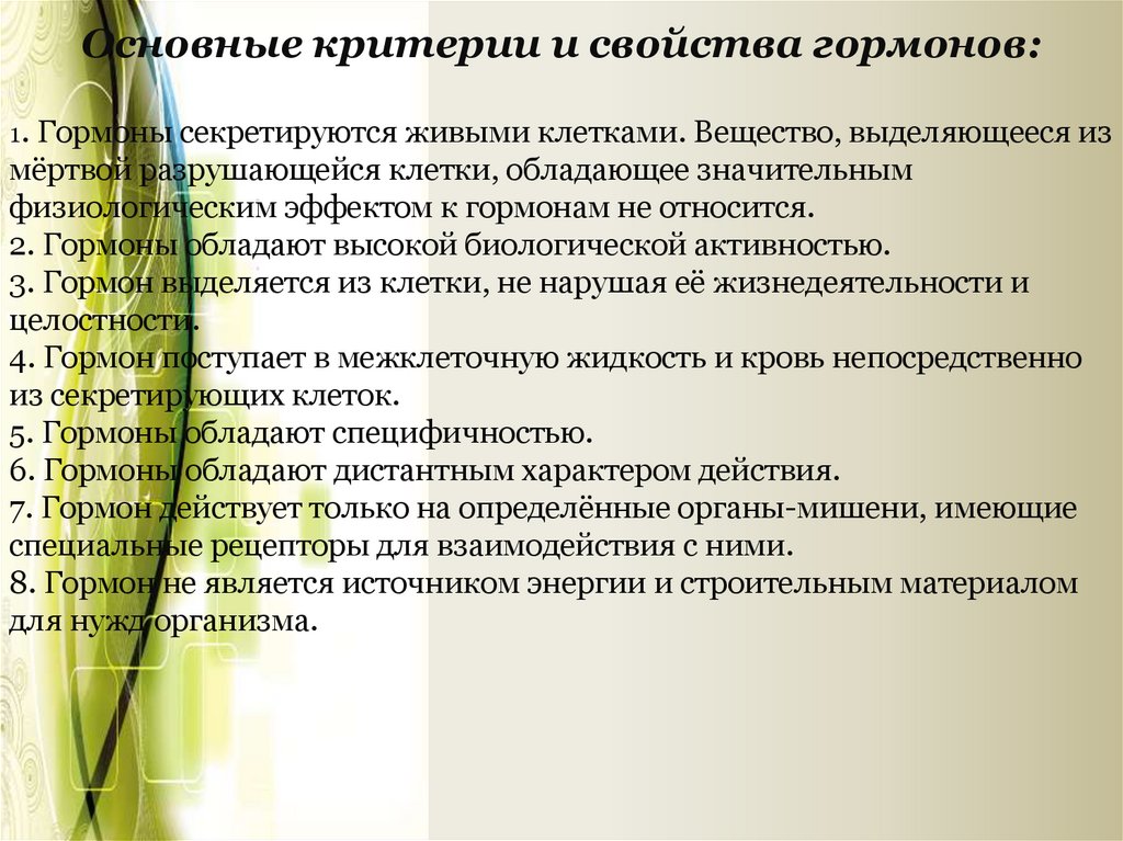 Основные критерии и свойства гормонов:1. Гормоны секретируются живыми клетками. Вещество, выделяющееся из
