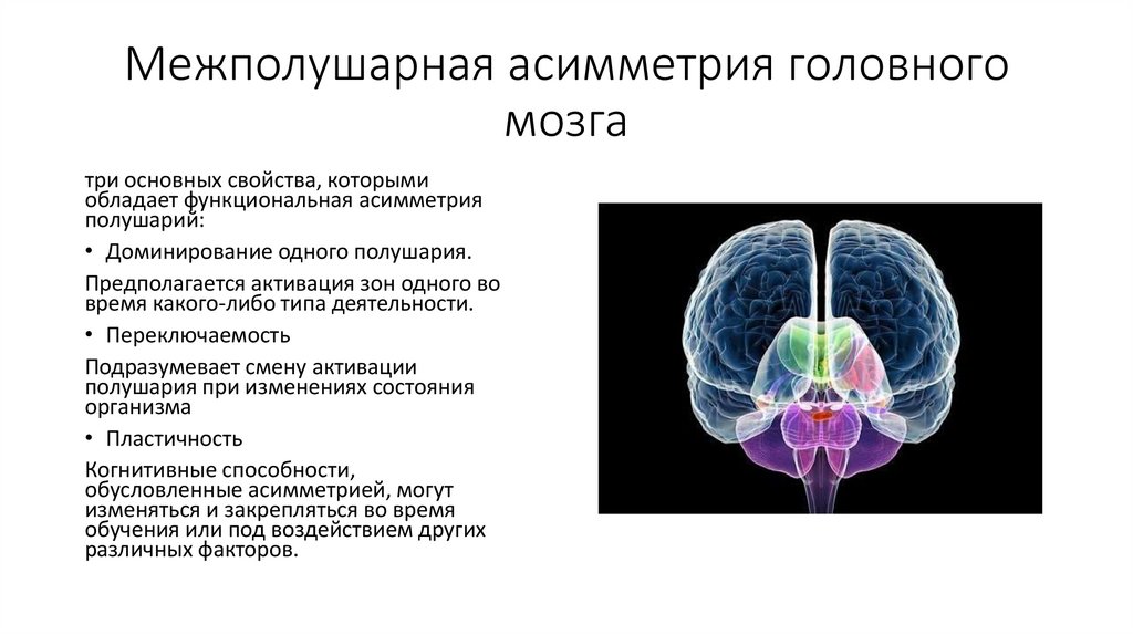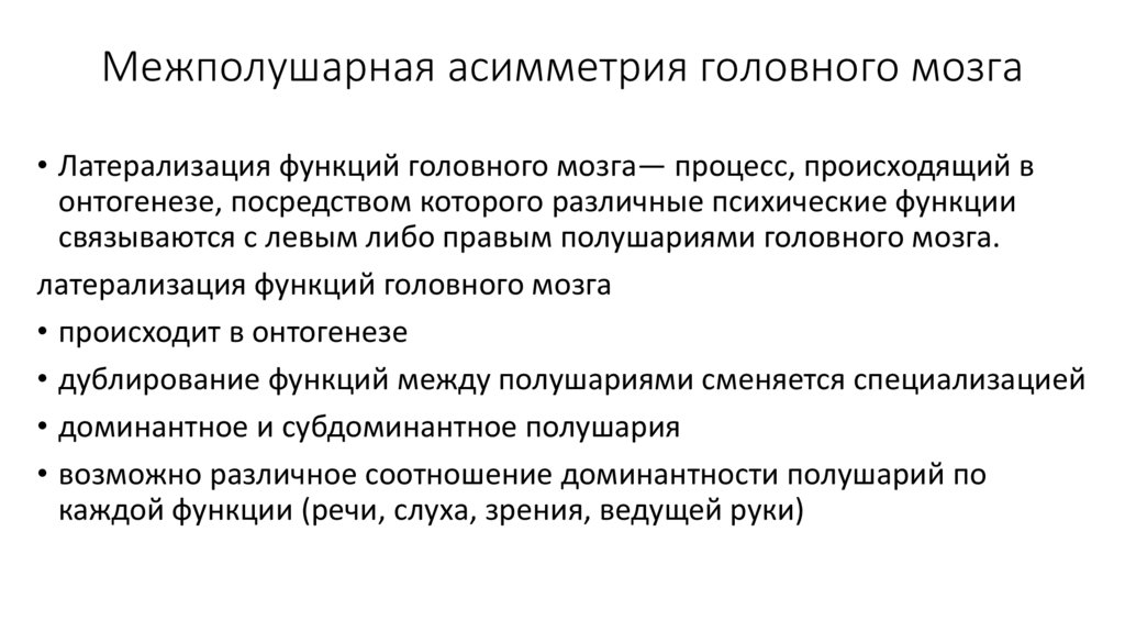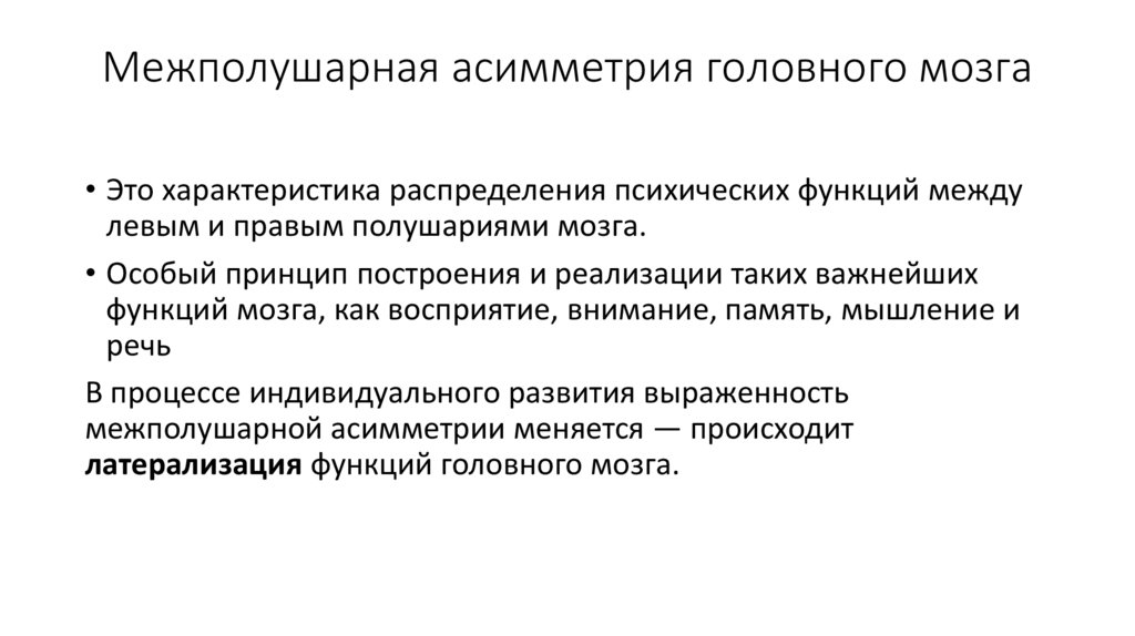 Межполушарная асимметрия головного мозга• Латерализация функций головного мозга— процесс, происходящий в