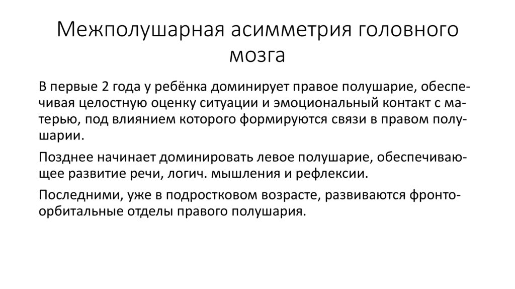 В первые 2 года у ребёнка доминирует правое полушарие, обеспечивая целостную оценку ситуации и эмоциональный контакт с матерью, под влиянием которого формируются связи в правом полушарии.