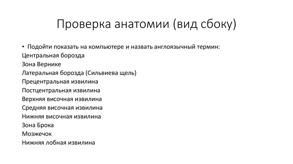 Проверка анатомии (вид сбоку)• Подойти показать на компьютере и назвать англоязычный термин: