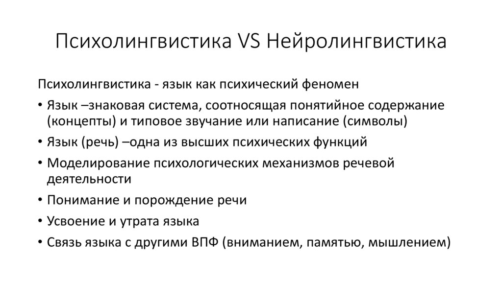 Психолингвистика VS НейролингвистикаПсихолингвистика - язык как психический феномен
