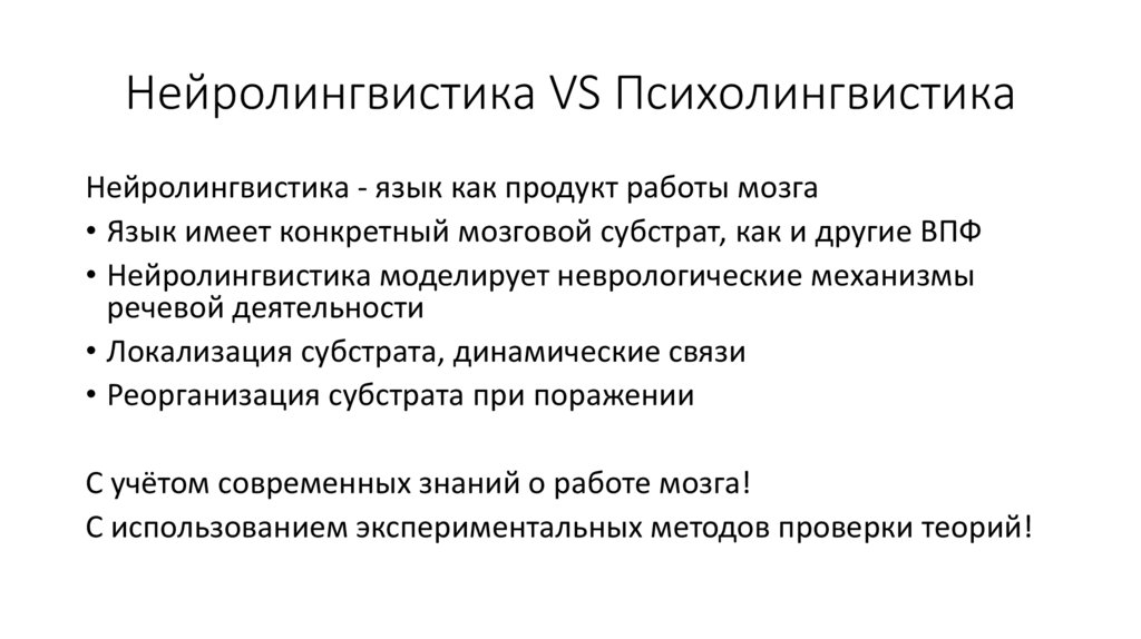 Нейролингвистика VS ПсихолингвистикаНейролингвистика - язык как продукт работы мозга