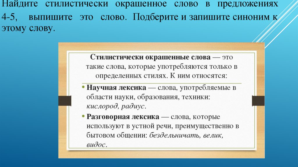 Найдите стилистически окрашенное слово в предложениях4-5, выпишите это слово. Подберите и запишите синоним к