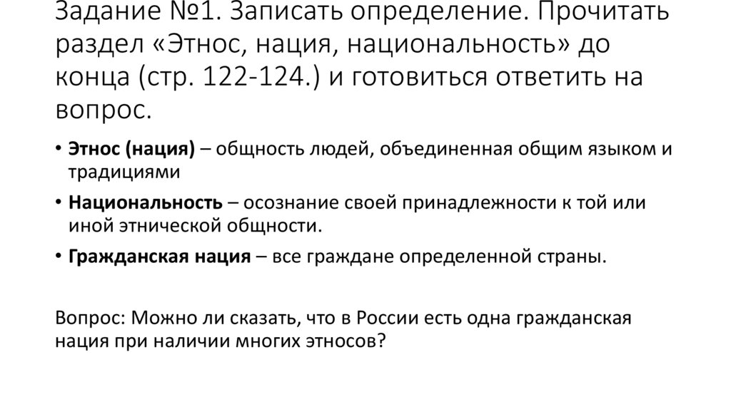 Задание №1. Записать определение. Прочитатьраздел «Этнос, нация, национальность» до