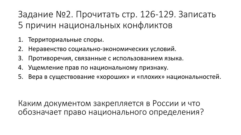Задание №2. Прочитать стр. 126-129. Записать5 причин национальных конфликтов