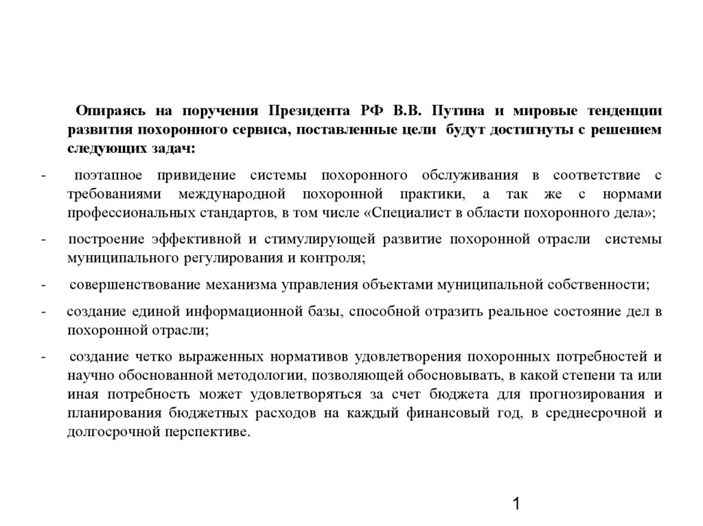 Опираясь на поручения Президента РФ В.В. Путина и мировые тенденцииразвития похоронного сервиса, поставленные цели будут достигнуты с решением
