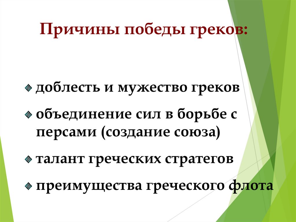 Причины победы греков:доблесть и мужество греков
