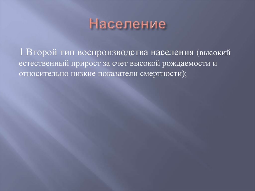 1.Второй тип воспроизводства населения (высокийестественный прирост за счет высокой рождаемости и