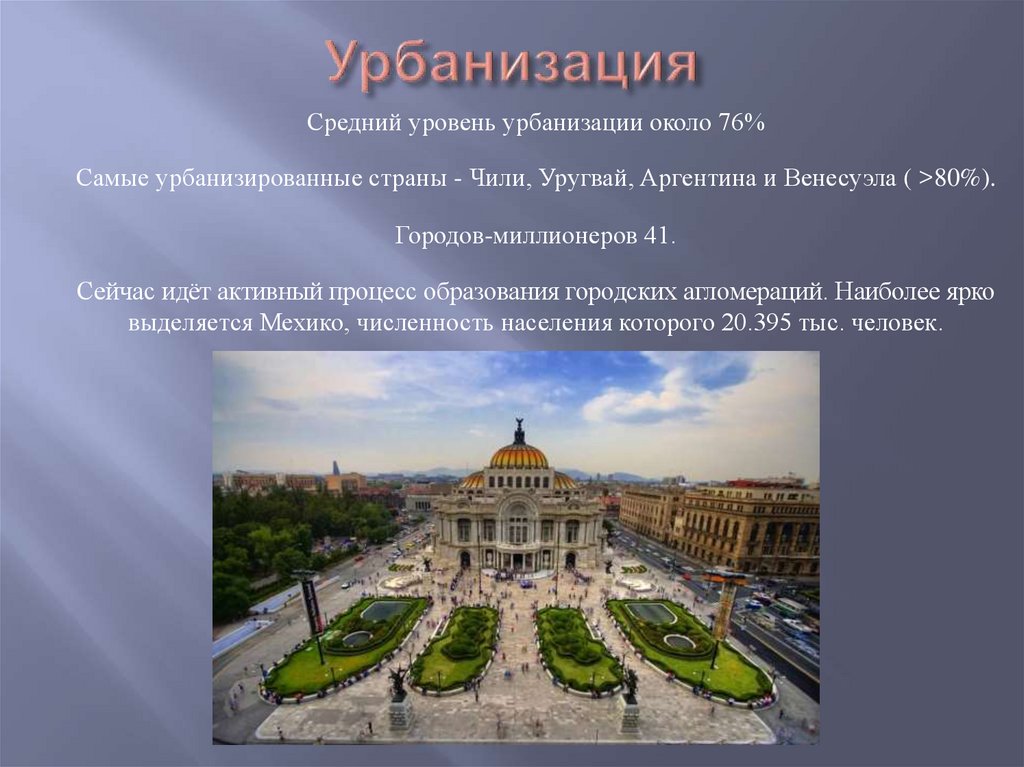 Средний уровень урбанизации около 76%Самые урбанизированные страны - Чили, Уругвай, Аргентина и Венесуэла ( >80%).